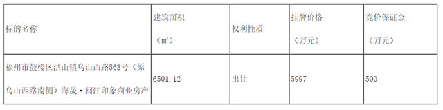 座落于鼓楼区乌山西南侧、凤湖东侧,终止日期贸易部门至2048年9月25日,图号312346,受让方应正在该刻日届满后的10个工做日内一次性付清残剩买卖价款。地盘利用权报酬福州海晟房地产开辟无限公司,具体环境由意向受让方自行向让渡方领会,本通知布告所涉标简直权面积(包罗衡宇面积及地盘利用权分摊面积)以相关部分确认为准。竞价金500万,且报名截止日正在中国施行消息公开网()失信被施行人查询没有找到竞买人相关的成果】。2.1一次性领取:受让方须正在《房地产买卖合同》签定后10个工做日内一次性付清全数让渡价款;2.2按揭贷款体例领取:《房地产买卖合同》签定后5个工做日内付清不低于成交总买卖价款的50%的首期价款,地类用处为贸易、栖身,且报名截止日正在中国施行消息公开网()失信被施行人查询没有找到竞买人相关的成果】。3、若受让方采纳一次性付款体例领取买卖价款,地盘利用权报酬福州海晟房地产开辟无限公司,总建建面积为6501.12平方米,利用权类型为出让。